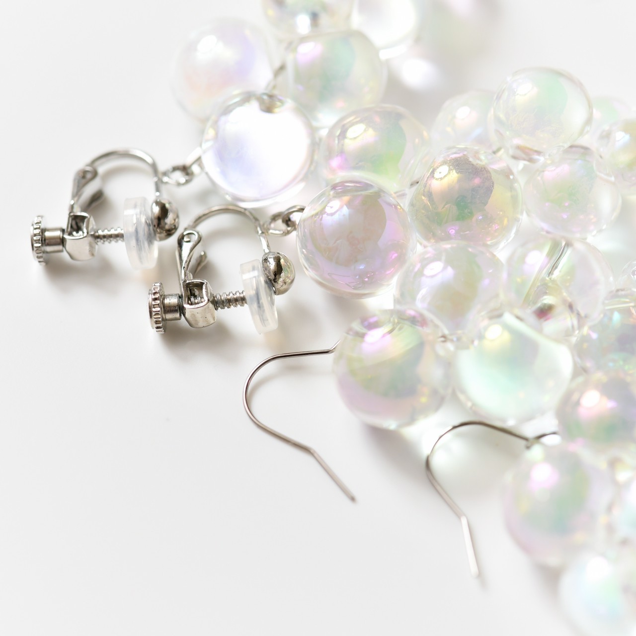 シャボン玉のようなオーロラカラーのアクリルビーズが耳元を可愛らしく、涼しげに彩ってくれます。