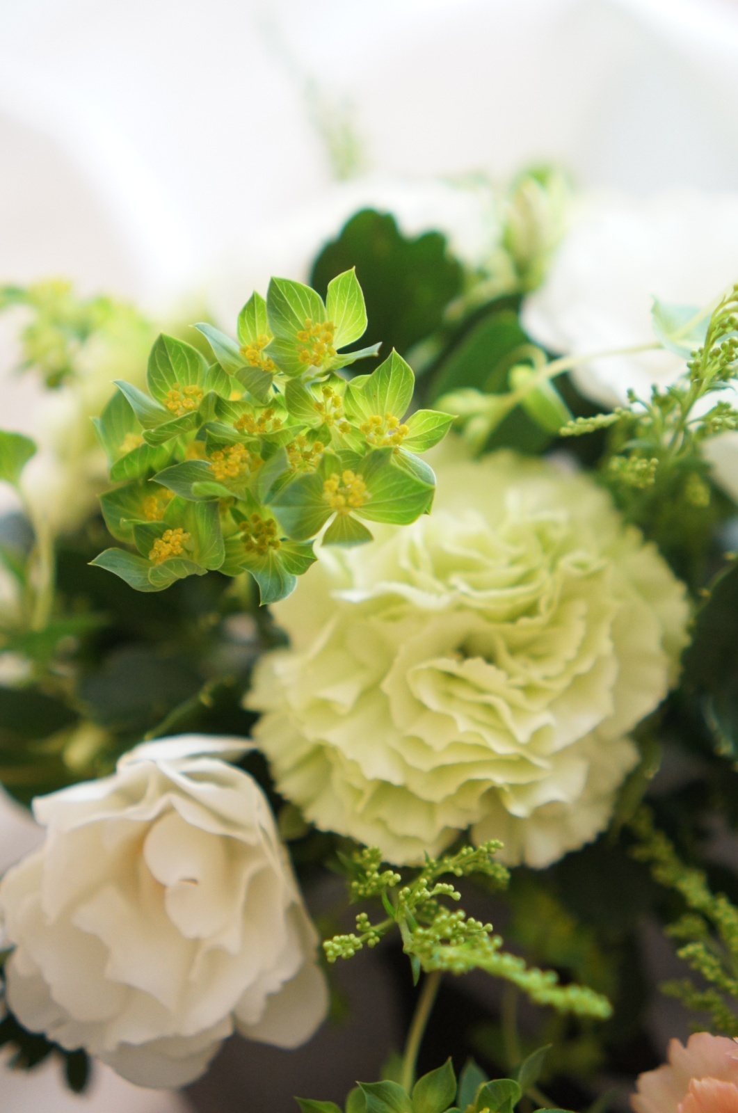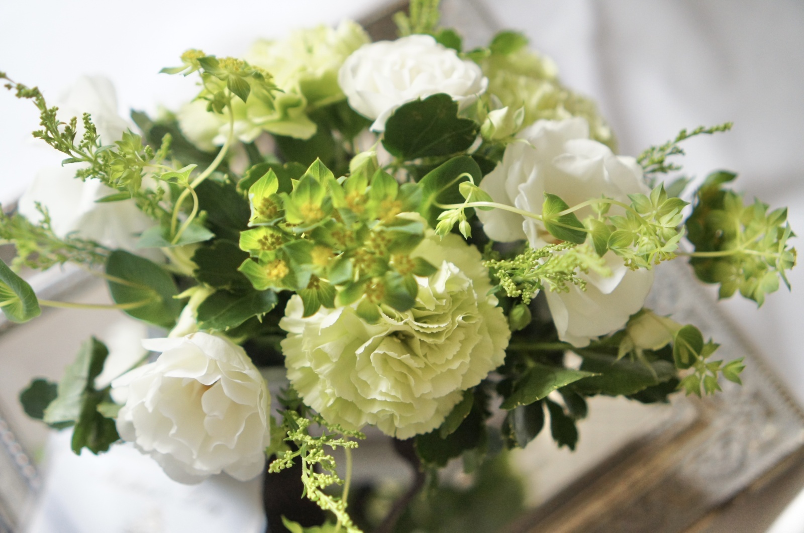 白とグリーンでまとめた、清潔感あふれるアレンジメント。